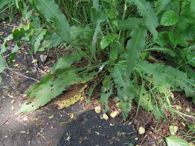 | ▼下部の葉の葉身は長さ約25cm、長い葉柄がある。 | ▼葉身の基部は切形。 | |
