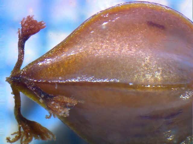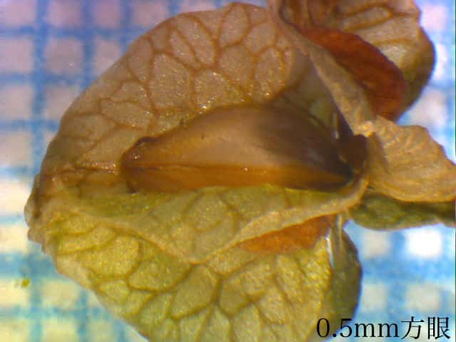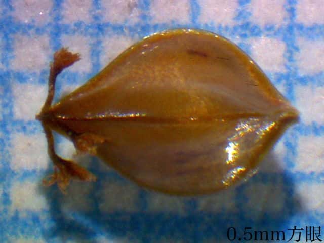 | ▼内花被片の中に果実が1個ある。 | ▼果実は長さ約2.5mm、先端に柱頭が残る。 | ▼果実は3稜形。 |