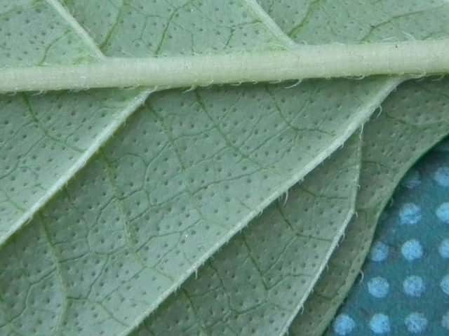 | ▼葉の基部はくさび形で葉柄に流れる。 | ▼葉の裏面に腺点がある。 | |