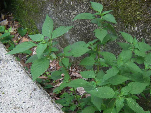 | 1年草 北海道〜九州の山地や道ばたに生える。高さ30〜60cm。全体に強い香りがする。葉は対生し、長さ3〜9cm、幅1〜4cmの卵形〜狭卵形で先はとがり、ふちには鋸歯がある。枝先に花穂をだし、淡紅紫色の小さな花をつける。花冠は長さ約5mmの唇形で、ふちは細かく裂け、毛が生えているように見える。花の反対側に苞が整然と並び、苞は中心部がもっとも幅広く、ふちには短毛があるが、背面は無毛。花期は9〜10月。(野に咲く花) 学名は、Elsholtzia ciliata シソ科ナギナタコウジュ属 |