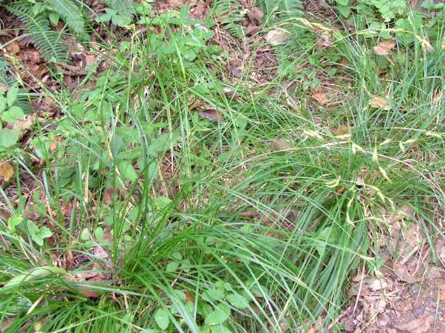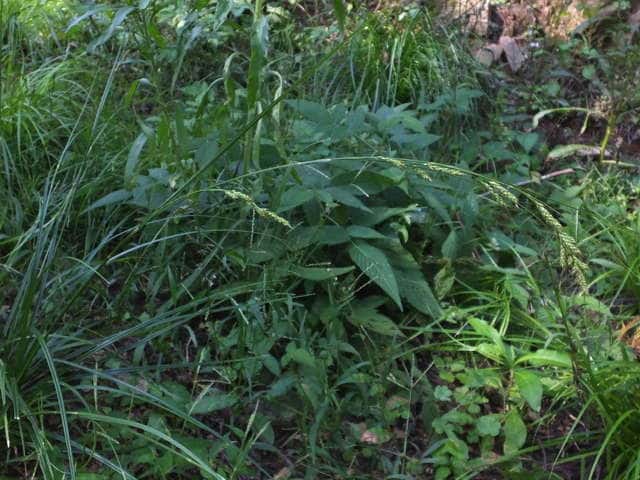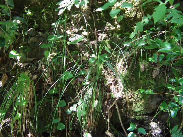 | 常緑多年草。 関東・新潟県以西〜九州の平地から低山地の樹林内や林縁林床や林縁に生える。根茎は短く叢生し、匐枝は出さない。基部の鞘は葉身があり、濃褐色で後に繊維に分解する。葉は硬く濃緑色、幅2〜4mm。有花茎は高さ40〜80cm。苞は有鞘、上方のものは刺状、下方のものは小穂より長い葉身がある。小穂は1節に1〜3個つけ、ときに枝を分け、長さ1〜2cm、幅3〜3.5mm、すべて雄雌性で、雄花部は短い。果胞は長さ2.8〜3.5mm、脈が目立ち、やや開出した短毛がある。柱頭は2岐、果実の断面はレンズ状。果期は9〜11月。(日本のスゲ) 学名は、Carex lenta カヤツリグサ科スゲ属ナキリスゲ節 よく似たコゴメスゲは果胞が長さ2.5〜3mm、ナキリスゲは2.8〜3.5mm。匍匐枝はなく大株となる。センダイスゲは長い匍匐根茎があり疎らに生え、果胞は長さ3〜3.5mm。 |