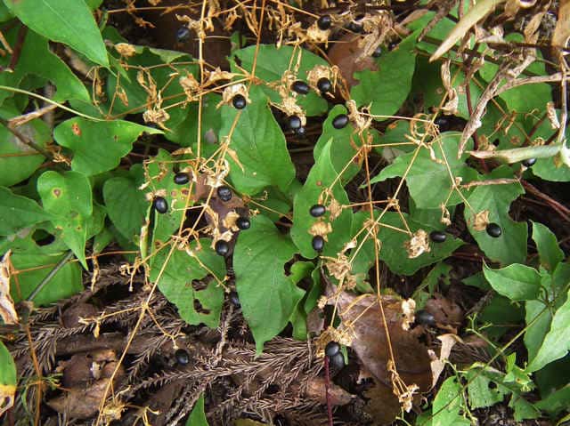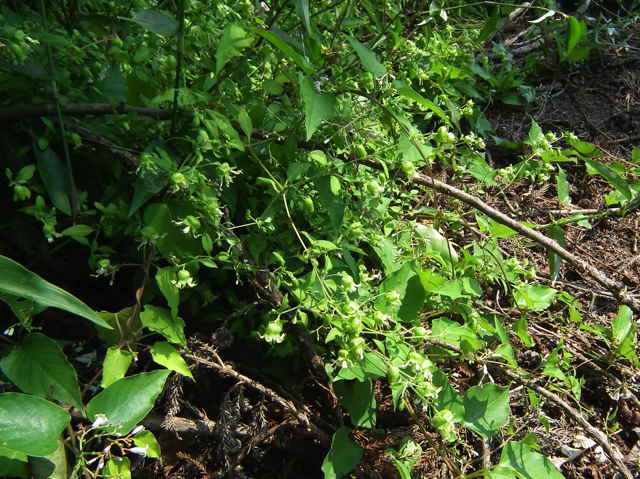 | 多年草 北海道〜九州に生える。茎は1.7mに達し、分枝が多く、ちじれた毛があり、節から根をだす。葉は卵形、まれに卵状披針形、全縁、ちじれた毛があり、質は薄く、長さ3〜9cm、鋭頭または鈍頭、基部は急に狭まって葉柄となるかまたは次第に狭くなり葉柄となる。葉柄は4〜7mm。花は枝の先に横向きに咲く。萼は初め筒状長さ1cm、開花すると中ほどまでさけ、花後は開出して宿存する。花弁は5、白色、長さ15mm、先は2裂、雄ずいは10、花柱は3、子房は1室。果実は萼との間に1〜2mmの柄があり、球形で径6〜8mm、やや肉質で漿果様。種子は黒褐色、円形、径1〜1.5mm。花期は8〜9月。(野に咲く花) 学名は、Silene baccifera var. japonica ナデシコ科マンテマ属 |
