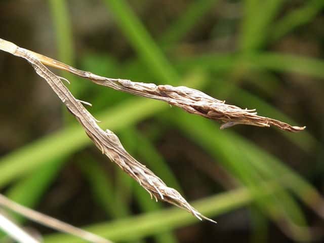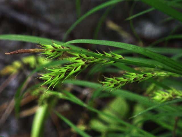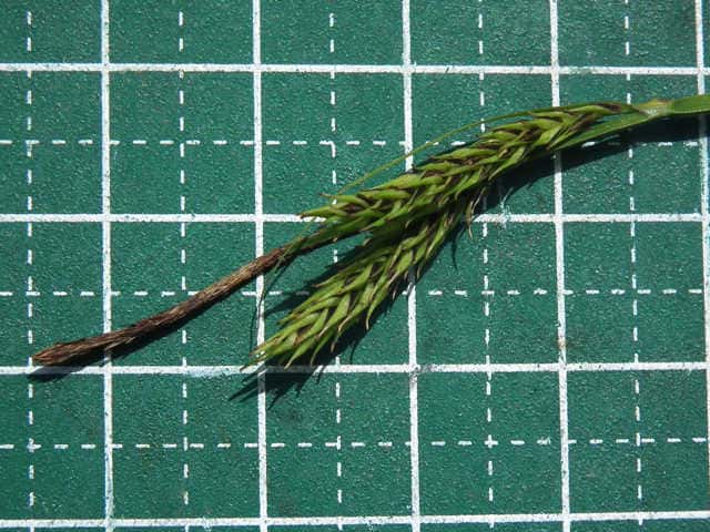 | ▼雄小穂は長さ約2cm。 | ▼雌小穂は長さ約3cm。 | ▼雌鱗片は紫褐色、果胞の半長以下。 |