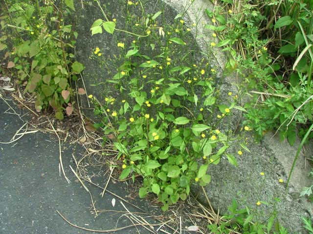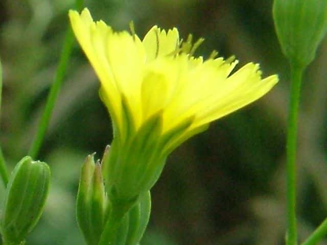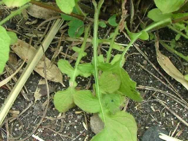 | 1年草 ヨーロッパ原産。1959年に神奈川県で見いだされ、東海地方などで散発的に帰化状態にあった。茎は上部をのぞいて白い短毛を布いて直立し、高さ80cmほどになる。茎の下部につく葉は有柄で、頂裂片は卵形で大きく、基部はダイコンの葉のように深裂する。茎の上部の葉は無柄で長菱形〜披針形で粗い鋸歯を有する。茎の上部で分岐し、直径1cmほどの黄色の舌状花のみからなる頭状花を多数つける。そう果は冠毛を欠く。花期は夏〜秋。(日本帰化植物写真図鑑) 学名は、Lapsana communis キク科ナタネタビラコ属 |