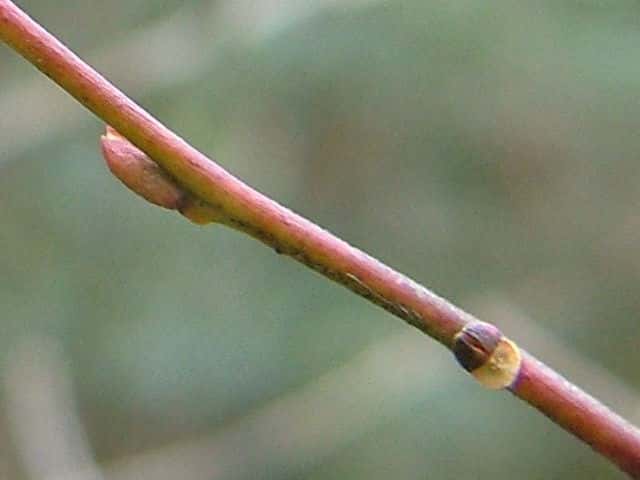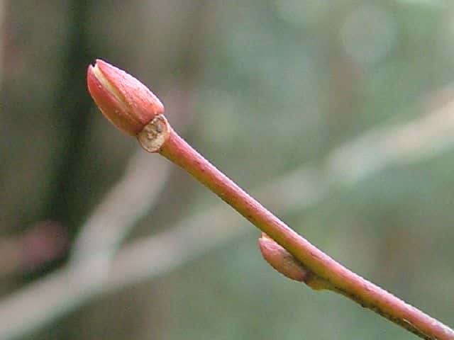 | ▼種子の表面に縦の筋模様がある。 | ▼冬芽は2個の芽鱗が向き合う。 | |