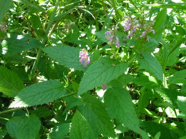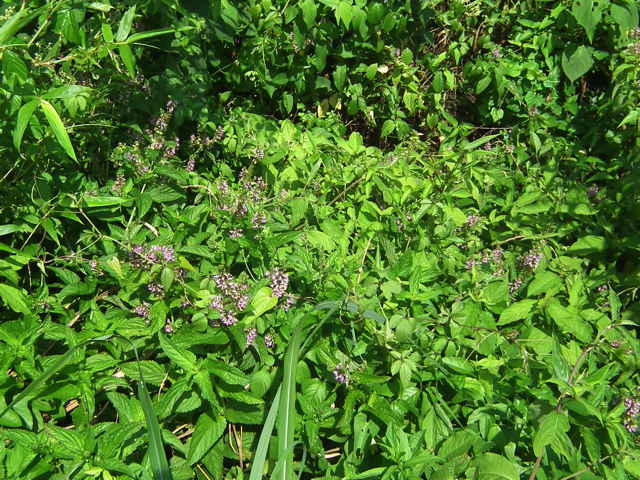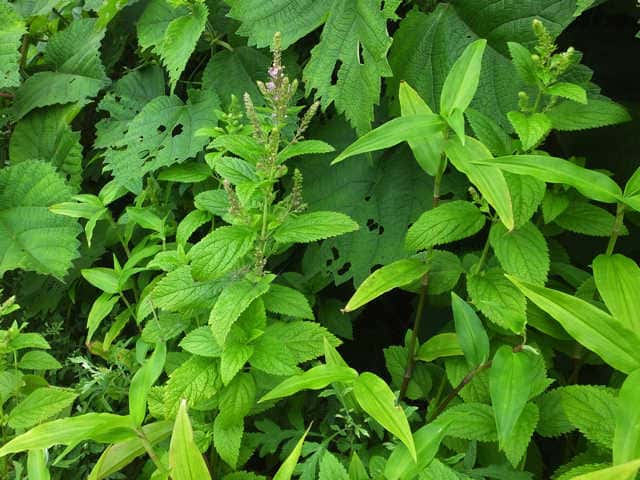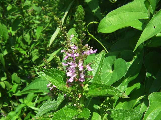 | 多年草 日本全土の山野のやや湿った半日陰のようなところに生える。高さ30〜70cm。地下に細長い走出枝を出す。葉は対生し、長さ5〜10cm、幅2〜3.5cmの卵状長楕円形または広披針形で、先端は鋭くとがり、ふちには不ぞろいの鋸歯がある。葉の脈は表面でへこみ、よく目立つ。枝先に長さ3〜10cmの花穂をだし、淡紅色の小さな花をつける。花冠は長さ1〜1.2cm。上唇は小さくて深く2裂する。下唇は3裂し、中央裂片が非常に大きく、舌のように垂れ下がる。上唇の裂片は下唇の側裂片にくっついているので、下唇が5裂しているように見える。雄しべと雌しべは上唇の裂け目から外につきでる。花冠にカメムシの仲間の幼虫が寄生して、虫えいになることが多い。花期は7〜9月。(野に咲く花) 学名は、Teucrium japonicum シソ科ニガクサ属 花のよく似たツルニガクサは萼に腺毛がある。 |
