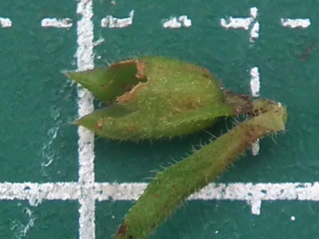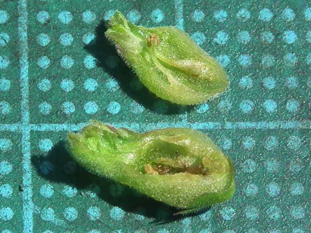 | ▼萼の上側、長さ約4mm。 | ▼萼の下側の2裂片は細長い。 | ▼萼には腺毛はない。 |