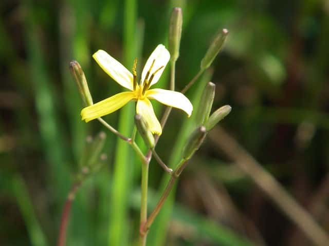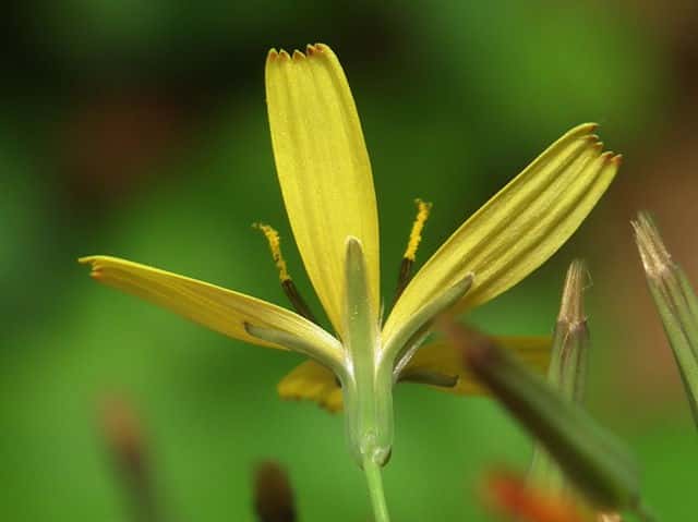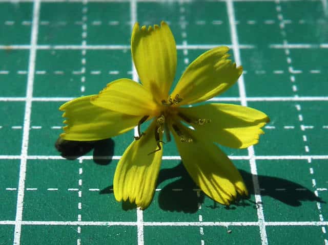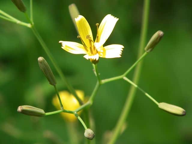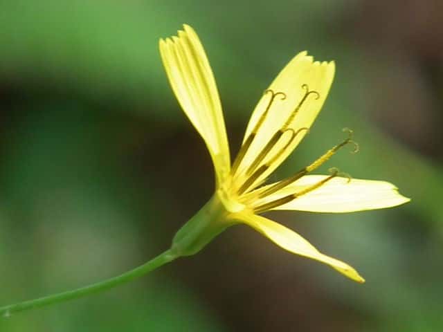 | 多年草 日本全土の日当たりのよいところにごくふつうに見られる。茎は直立して高さ20〜50cmになる。根生葉は長い柄があり、葉身は長さ3〜10cm、幅0.5〜3cmの広披針形〜倒卵状長楕円形。茎葉はやや短くて柄はなく、基部はまるくはりだして茎を抱く。枝先に直径約1.5cmの黄色の頭花をつける。舌状花はふつう5個。総苞は長さ7〜9mmの円筒形。外片は非常に小さく、鱗片状になっている。そう果は長さ3〜3.5mmの紡錘形。花期は5〜7月。(野に咲く花) 学名は、Ixeridium dentatum subsp. dentatum キク科ニガナ属 変異が多く、舌状花の数がニガナの5〜7個と比較し8〜10個と多いハナニガナ、水田の畦に生え走出枝を出すハイニガナなどがある。 |