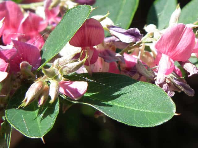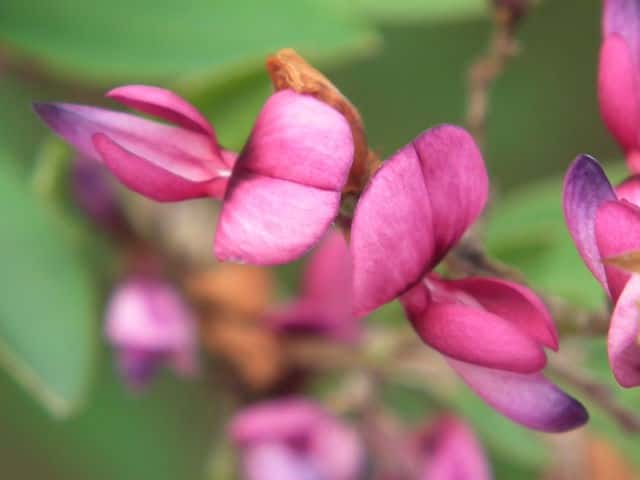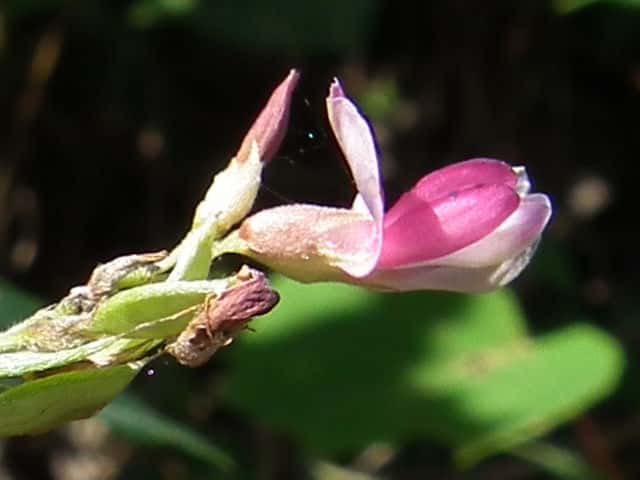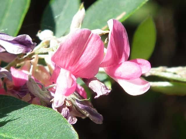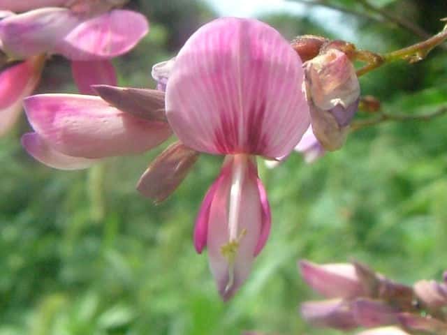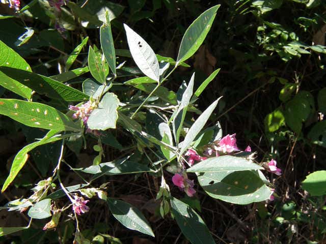 落葉半低木 ニシキハギはビッチュウヤマハギと同種とされることもあるが、ニシキハギは野生種であるビッチュウヤマハギが栽培されている間に他の種と交雑をして生じたいろいろな型の雑種の集合と考えられる。(ハギ属の分類(東京大学総合研究博物館))花期は8〜10月。 学名は、Lespedeza thunbergii subsp. thunbergii 'Nipponica' ビッチュウヤマハギ 本州中部以西〜九州に生える。高さ2〜3m。小葉は長さ2〜6cmの長楕円形で、両面に細毛がある。葉腋から長い花序を出し、花は濃紅紫色で長さ1〜1.3cm。旗弁の裏は淡紅白色で、先はわずかに尖る。翼弁より竜骨弁がやや長い。萼は4裂し、筒部よりも裂片が長く、先端は鋭く尖り細毛がある。別名 ニシキハギ。花期は8〜10月。 学名は、Lespedeza thunbergii subsp. thunbergii f. angustifolia マメ科ハギ属 |