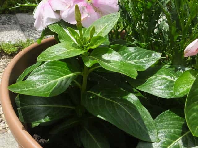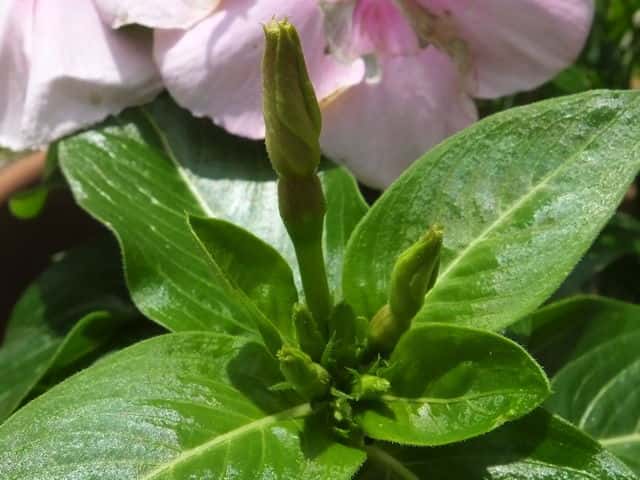 1年草 マダガスカル原産で熱帯各地に野生化する。原種は小低木だが、日本では冬に枯れるため1年草として扱われる。花期は4〜11月 学名は、Catharanthus roseus キョウチクトウ科ニチニチソウ属 |