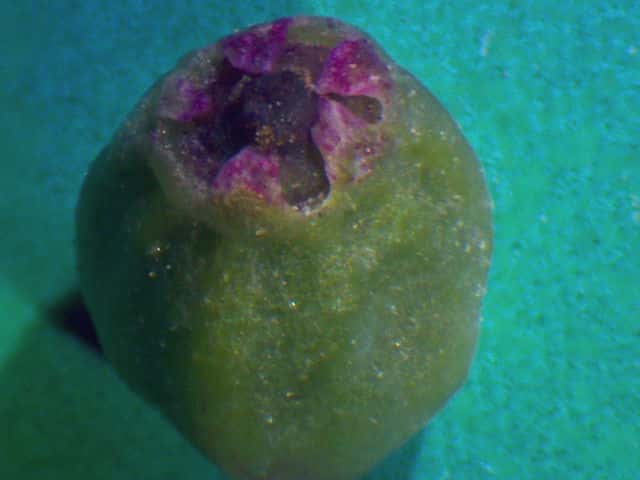 | ▼萼は小さく退化している。(花の裏側) | ▼幼果、長さ約5mm。先端に小さな萼片が残っている。 | |