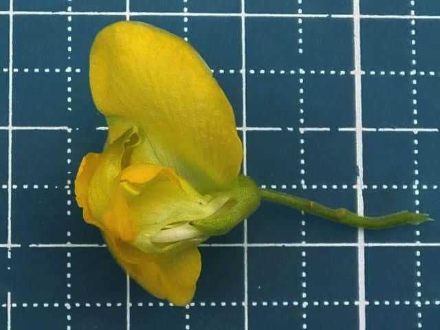 | ▼旗弁は長さ約1.5cm、幅約2.5cm。 | ▼竜骨弁から雄しべを引き出した。 | |