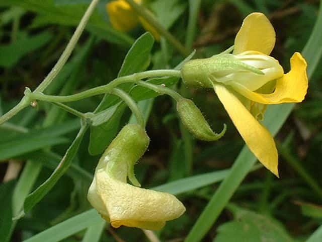 | つる性多年草 本州〜九州の日当たりのよいところに生える。全体に軟毛があり、葉の裏面と萼には赤褐色の腺点がある。葉は3小葉からなる。小葉は長さ、幅とも1〜3cmの卵状菱形。花は黄色で長さ1.5〜1.8cm。変わった形の蝶形花で、旗弁は右側が大きく、竜骨弁はクルリと曲がって左側の翼弁と一緒に上向きになる。右側の翼弁は竜骨弁の基部をとり巻いている。豆果は長さ約4cmの広線形で短毛が密生し、なかに6〜7個の種子が入っている。花期は8〜9月。(野に咲く花) 学名は、Dunbaria villosa マメ科ノアズキ属 よく似た仲間にヤブツルアズキがある。ヤブツルアズキとの比較。 |