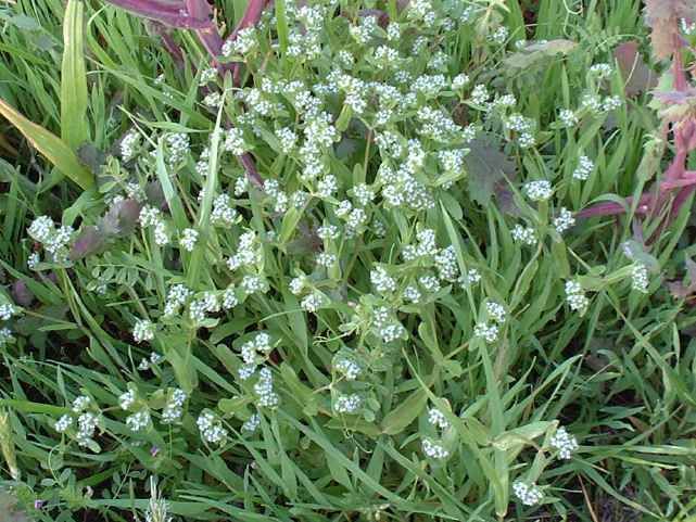 | 1〜越年草 ヨーロッパ原産。江戸時代に長崎で栽培されていたものが野生化したといわれ、本州や九州の道端などにみられる。茎は二又に数回分枝し、高さ10〜30cmになる。葉は対生し、長さ2〜4cmの長倒卵形〜長楕円形で、やわらかく、ふちには細かな毛が生えている。枝先に直径約2mmの淡青色の小さな花をびっしりつけ、長楕円形の苞葉が目立つ。花は漏斗状で先端は5裂する。雄しべは3個。花の下部には大きなまるい子房がある。果実は長さ約2mmでやや扁平。 花期は5〜6月。(野に咲く花) 学名は、Valerianella locusta スイカズラ科ノヂシャ属 |