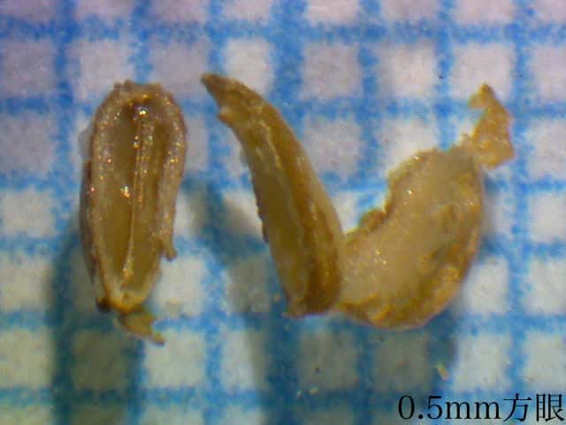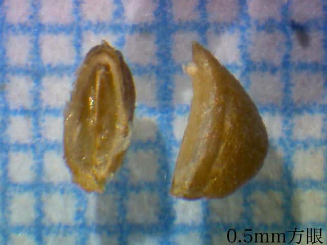 | ▼果実の上部。 | ▼果皮を除くと、未熟な種子が1個ある。 | ▼種子は長さ約2mm。 |