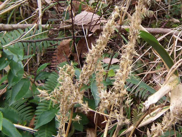 | 多年草 北海道〜九州の日当たりのよい草原に普通。地下茎は短く直立し、多くのひげ根がある。葉は根生して開出し、倒披針形、鈍頭から鋭頭、両面無毛、全縁、長さ12〜24cm。花茎は高さ15〜55cm、ほとんど無毛または上部に短毛があり、分枝しないか、または分枝する。細長い総状花序に多数の花をつける。花は上を向いて咲く。苞は線形、花柄は長さ2〜4mm、花被片は6、披針形、鈍頭、長さ6〜7mm、黄白色、外部中肋は緑色。基部短く合生する。雄しべは6、花被片より短く、花糸は下部が少し幅広くなり、無毛、基部は花被に合生する。子房は周位、卵形、花柱は柱状。さく果は卵形で花柱を宿存し、長さ7mm(うち花柱3mm)、花被片は宿存しさく果を包む。種子は卵形、長さ0.7mm。花期は7〜8月。(原色日本植物図鑑) 学名は、Metanarthecium luteoviride キンコウカ科ソクシンラン属 葉のよく似たショウジョウバカマは葉の中心から花茎が立つ。 |