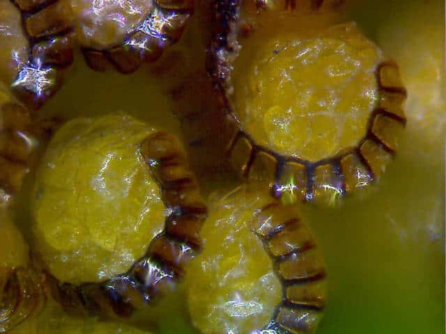| v胞子が詰まった胞子嚢。 | ▼膜が破れて胞子が出る。 | ▼胞子。 |