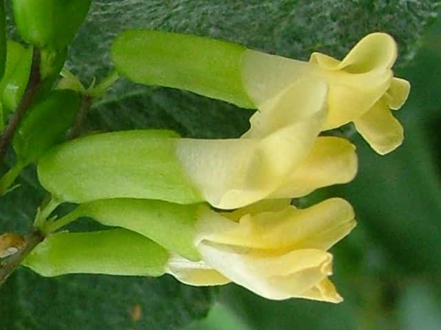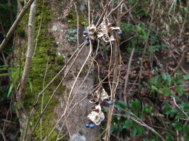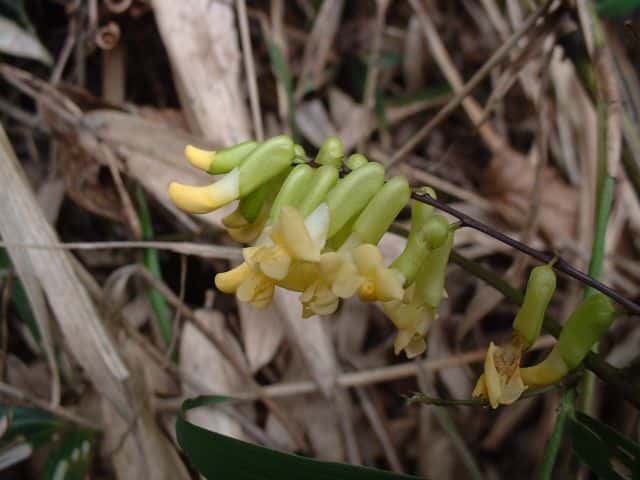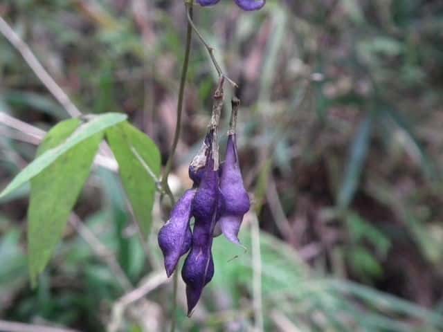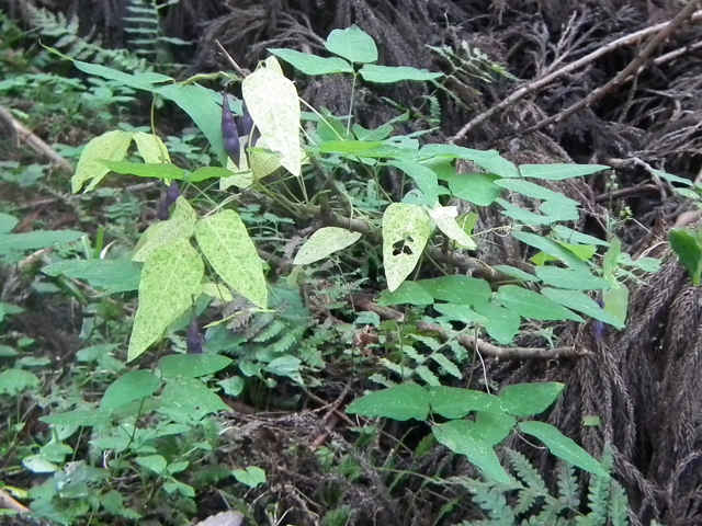 | つる性多年草 本州〜九州の山地の林縁などに生える。茎は黒紫色を帯びることが多い。葉は3小葉からなり、裏面は白っぽく、まばらに毛がある。頂小葉は長さ3〜15cm、幅2〜6cmの長卵形。花は総状につき、淡黄色で長さ1.5〜2cm。萼は筒形で、萼片はほとんど目立たない。豆果は長さ2〜5cmの倒披針形で、種子のところで膨れて数珠状になる。熟すと紫色になり2裂し、中には3〜5個の種子が入っている。種子は黒紫色で白粉をかぶる。花期は8〜9月。(野に咲く花) 学名は、Dumasia truncata マメ科ノササゲ属 |