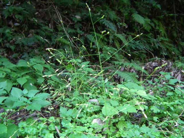 | 1年草 北海道〜沖縄の畑地や田のあぜ、路傍、空き地などに生育し、やや群生する。茎は高さ30〜120cm、細長く、直立し、基部は分けつして叢生する。葉は長さ5〜20cm、幅4〜13mm、無毛。花序は卵円形、長さ15〜30cm、花序の枝はほとんど水平に開出し、緑紫色の小穂をまばらにつける。小穂は倒卵形、長さ2〜2.5mm、2小花からなるが第1小花は退化して護穎のみとなる。第1苞穎は長さ1mm、第2苞穎は第1小花の護穎と同長。第2小花の護穎と内穎は厚くガラス光沢がある。果実は広楕円形、突頭、暗褐色、長さ1.5mm。花期は8〜9月。(日本イネ科植物図譜) 学名は、Panicum bisulcatum イネ科キビ属 |