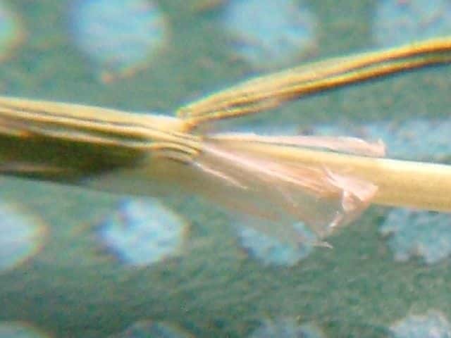 | ▼小花の芒は長さ約4mm。 | ▼芒は護穎の背から伸び、護穎の基部に白色の毛があり、上部にも毛がある。 | |