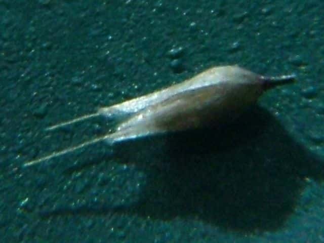 | ▼小穂は長さ約2.5mm、2個の芒が出る。 | ▼2個の苞穎、芒はほぼ同長。 | ▼小穂には2小花があり、各々に芒がある。 |