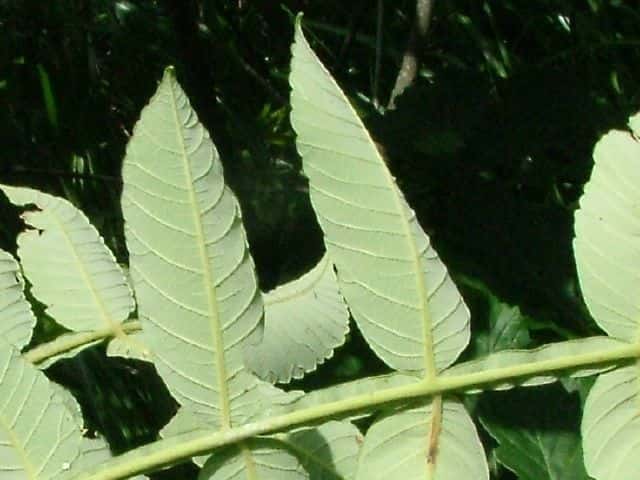| ▼葉は大きな奇数羽状複葉。 | ▼葉軸に翼がある。 | ▼葉軸の翼。 |