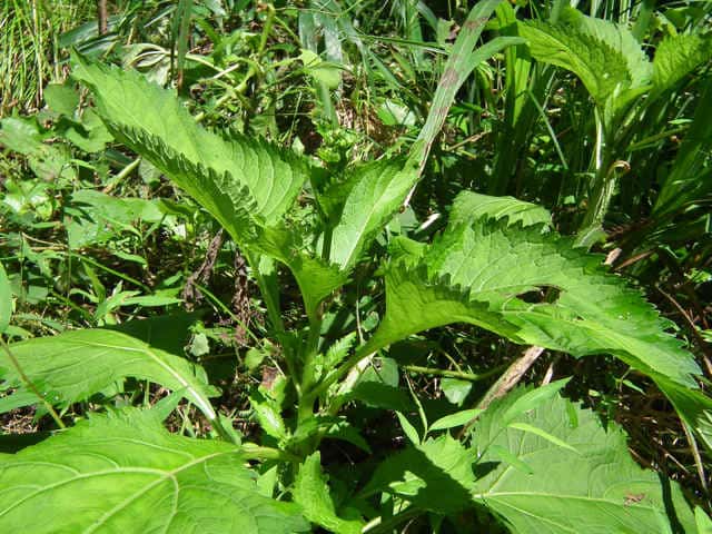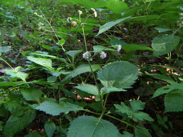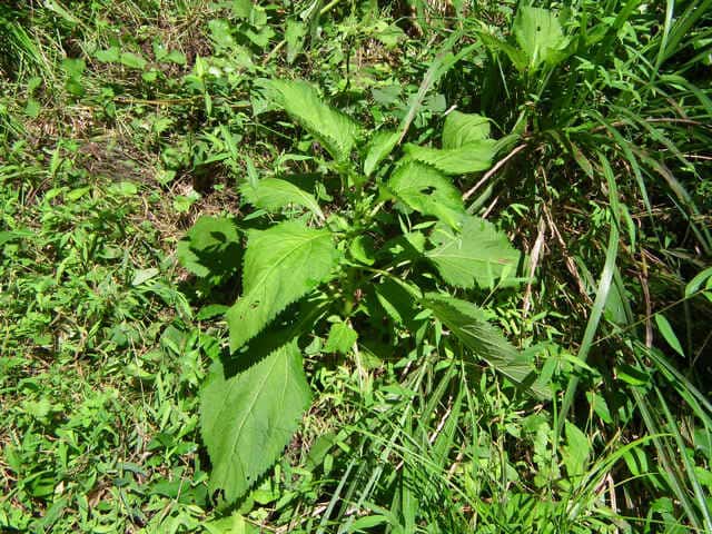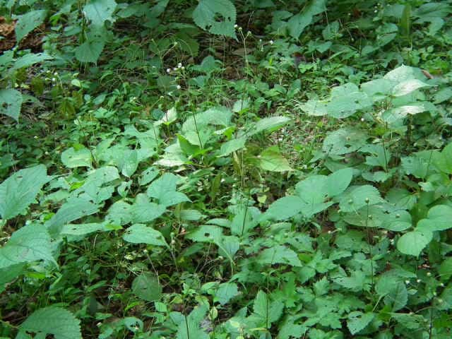 | 多年草。 本州(関東地方以西〜琉球)の湿った林縁に生える。根茎は肥厚する。茎は直立して高さ30〜150cm、基部は短くはって発根する。葉はヌマダイコンよりも多くて8〜12対、大きくて幅広く、中部のものでは長さは柄を含めて15〜40cm、幅7〜22cm、葉柄は長さ5〜10cm、葉身は卵形ないし広卵形で鋭頭、基部は円形〜切形、縁の鋸歯は多くて20〜30対、高くてとがる。頭花は長い柄の先に数個ずつ散房状について短い有毛の柄があり、総苞は球形で径9〜10mm。総苞片は基部で合生し、先は鈍く、果時には反曲する。小花は30個内外とヌマダイコンよりやや多く、花冠は少し短く約2mm。外面には毛を密生する。花柱分枝は長さ約1.5mmで花冠からいちじるしく超出する。そう果は長さ約3.5mm、黒褐色で光沢がなく、表面にまばらに膜質の微突起があるが、乾いてもかさぶた状にならない。冠毛は3または4個で長さ約0.7mm。(日本の野生植物) オカダイコン(徳島県立博物館) 学名は、Adenostemma madurense キク科ヌマダイコン属 |