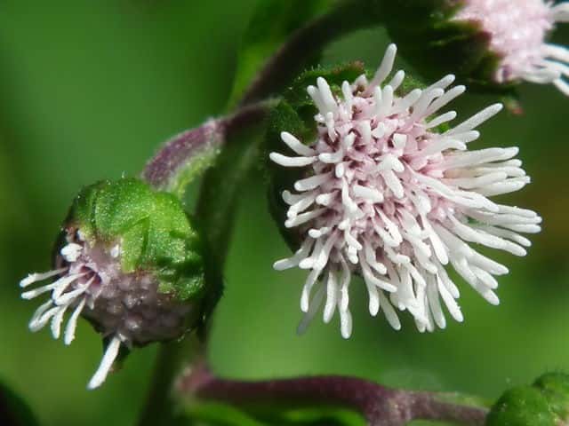 | ▼総苞を一部取り除いた。 | ▼1つの筒状花。筒部に腺毛がある。 | ▼子房の上部にこん棒状の冠毛がある。 |
