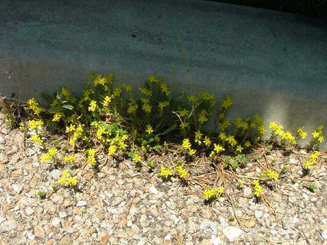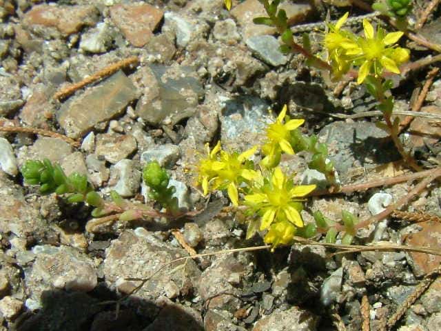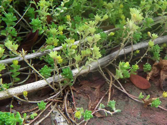 | 常緑多年草 原産地不明で日本各地に帰化。海岸から内陸部まで石垣や市街地の道路脇などに見られる。海岸植物のタイトゴメに非常によく似ているが、タイトゴメより全体が小形で、葉が円柱状のタイトゴメに対して葉がやや角張っている。葉は互生し、上部の葉は非常に密につく。葉の縁には細かい突起がある。花は直径8mm、花弁は5枚で、挟披針形。雄しべの葯は黄色い。 花期は6〜7月。(広島の山野草) 茎は高さ4〜8cm、葉は長楕円形で密に互生し、長さ約3mm、幅1.5〜2mm、円頭、断面は半月形、辺縁には微小な突起がある。花は茎頂の集散状の花序に数花をつけるか、茎上部の葉腋につき、黄色、径約8mm。花弁は広披針形、長さ約4mm、雄蕊は花弁より短く、葯は黄色。袋果は開出する。(HP関西の花) 学名は、Sedum japonicum subsp. oryzifolium var. pumilum ベンケイソウ科マンネングサ属 よく似た花でヨーロッパタイトゴメがあり、葉が三角状卵形、長さ3〜5mm。 |