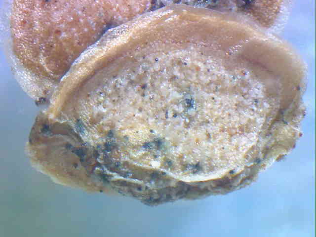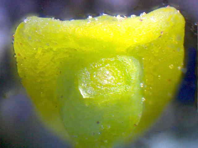 | ▼若い果実、長さ約3mm。 | ▼上部に膨らみがある。 | ▼上部が膨らみ、下部は皿状になる。 |