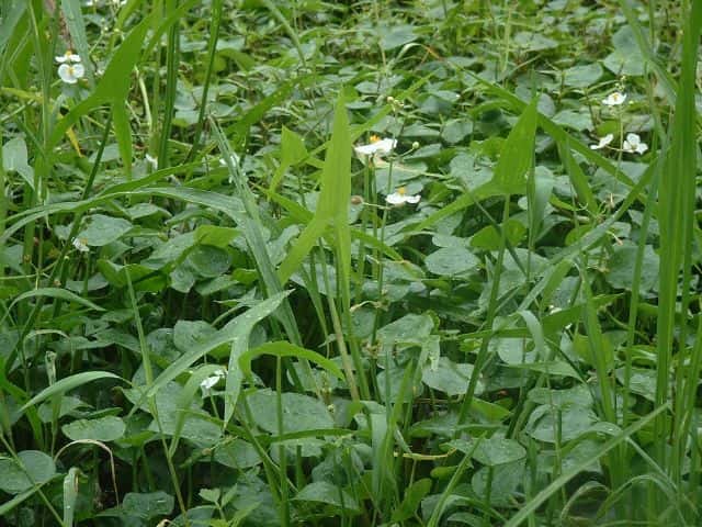 | 多年草 北海道〜沖縄の湖沼やため池、水路、水田などに生育する抽水〜湿生植物。葉は根生、幼葉は線形。狭長楕円形の葉を経て矢尻形の葉身となる。葉柄は長さ15〜60cm、葉身の頂裂片は挟三角形〜卵形でアギナシより幅広い場合が多い。葉身の側裂片は頂裂片より長く、先は鋭く尖る。全長7〜30(〜40)cm。花茎は長さ20〜100cmであるが、葉の上部より高くなることはない。花の形態はアギナシと同じ(3輪生の総状花序の下方に雌花、上方に雄花をつける。花弁は3枚で白色。雌しべ、雄しべともに多数。)であるが、雄花と雌花の中間位置に両性花がつくこともある。果実は長さ3〜6mm、周囲に広い翼がある。球状に集合して、成熟すると次々と脱落する。秋には葉の基部から数本〜多数の走出枝を伸ばし、先端に塊茎を形成して越冬する。花期は8〜10月。(日本の水草) 学名は、Sagittaria trifolia オモダカ科オモダカ属 クワイは、根の先端にできる球茎を食用にするため栽培改良されたものであり、高さ60〜100cmになる。学名Sagittaria trifolia 'Caerulea' 似た花にアギナシがあるが、自然度の高い湿地などに生え水田にはほとんど生えない。また葉が線形となるウリカワや葉が披針形で葉柄があるヘラオモダカがある。 |