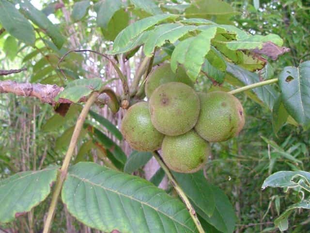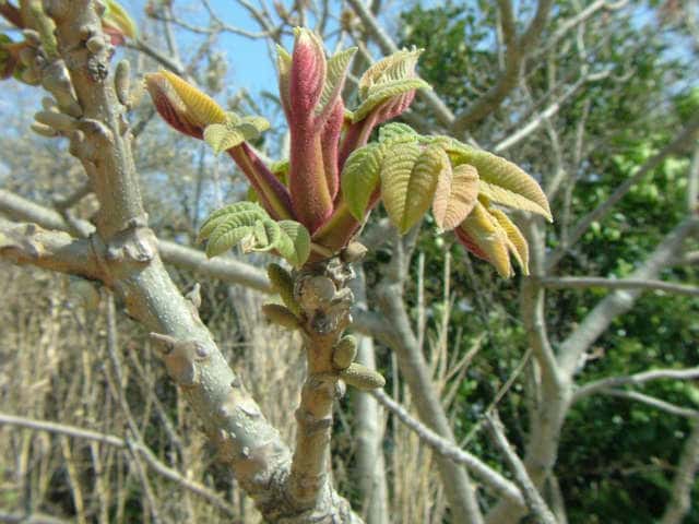 | 落葉高木 北海道〜九州の川沿いや窪地など、湿り気の多いところに生える。高さ7〜10mになる。樹冠はまるい。樹皮は暗灰色。縦に割れ目が入る。若い枝には短毛と軟毛があり、直径約2cmと太い。長楕円形の皮目が多い。葉は互生。奇数羽状複葉で長さ40〜60cm。葉柄と葉軸に褐色の軟毛や腺毛が密生し、小葉が5〜9対つく。小葉は長さ8〜18cm、幅3〜8cmの楕円形で、ほとんど無柄。先端は短く尖り、基部はややゆがんだ切形、縁には細かい鋸歯がある。表面は無毛。裏面には星状毛が密生する。雌雄同株。葉の展開と同時に開花する。雌花序は新枝の先端に直立し、雄花序は前年枝の葉腋から垂れ下がる。雄花序は長さ10〜22cm、小さな雄花が密集してつく。雄花には雄しべが12〜20個ある。雌花序は長さ6〜13cm、花軸には長毛と腺毛が密生し、7〜10個の花がまばらにつく。子房は苞と小苞、花被片が合着した筒状の花床に包まれる。花柱は2裂し、柱頭は濃赤色。果実は核果状の堅果。長さ3〜4cmの卵球形で、堅果の外側を肥大して肉質になった花床が包む。表面は褐色の毛が密生する。9〜10月に成熟する。堅果は長さ2.5〜3.5cmで、先端は尖り、表面にはしわがある。種子は食用にする。花期は5〜6月。 冬芽は裸芽。円錐形で先端はとがり、褐色の短毛が密生する。頂芽は特に大きく、長さ1〜1.6cm。葉痕は隆起し、大きくてよく目立つ。維管束痕は3つのグループに分かれる。(樹に咲く花) 学名は、Juglans mandshurica var. sachalinensis クルミ科クルミ属 |