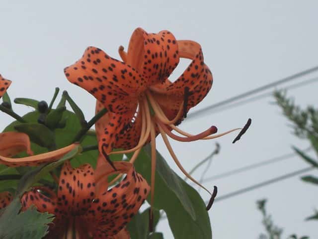 | 多年草 古い時代に鱗茎を食用にするため渡来したものらしい。朝鮮南部が原産地と考えられている。古くから栽培され、北海道〜九州の人里近くにしばしば野生している。茎は高さ1〜2mになり、暗紫色の斑点がある。茎の上部にははじめ白い綿毛がある。葉は互生し、長さ5〜18cm、幅0.5〜1.5cmの披針形〜広披針形で先はとがる。葉には柄がなく、基部に黒紫色の珠芽(むかご)ができる。茎の上部に直径10〜12cmの花を4〜20個つけ、横向きまたは下向きに咲く。花被片は強く反り返り、橙赤色で濃い色の斑点がある。花粉は暗紫色。種子はできない。花期は7〜8月。(野に咲く花) 学名は、Lilium lancifolium ユリ科ユリ属 日本には珠芽(むかご)をつけるユリは、オニユリしかない。似た花にむかごをつけないコオニユリがある。 コオニユリは実生から6〜8年立たないと開花しない。オニユリはムカゴから3年くらい、タカサゴユリは1年目に開花する。 |