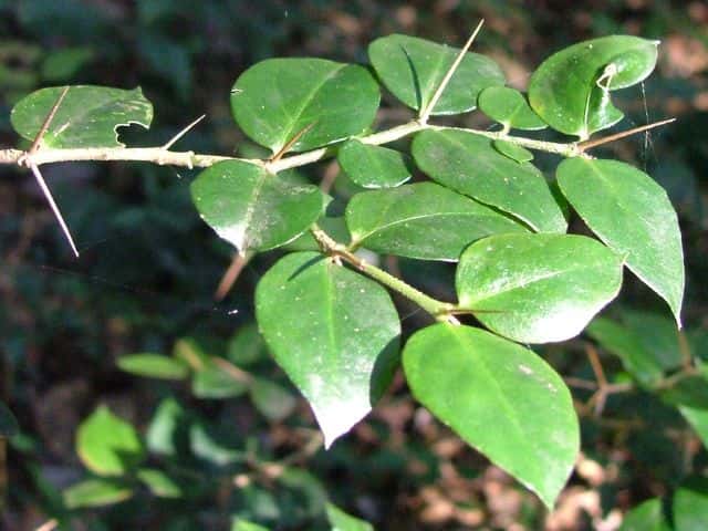 | ▼小さい葉(左)は長さ約1cm、大きい葉は長さ2〜4cm。 刺は長さ1.3〜1.8cm。 | ||