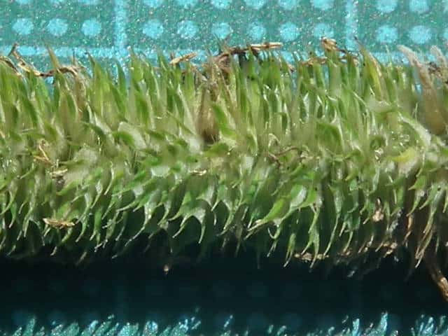| ▼苞穎は同形同長。先端が1mmの芒になる。 | ▼1個の小穂、 苞穎の背に長毛が並ぶ。 | |