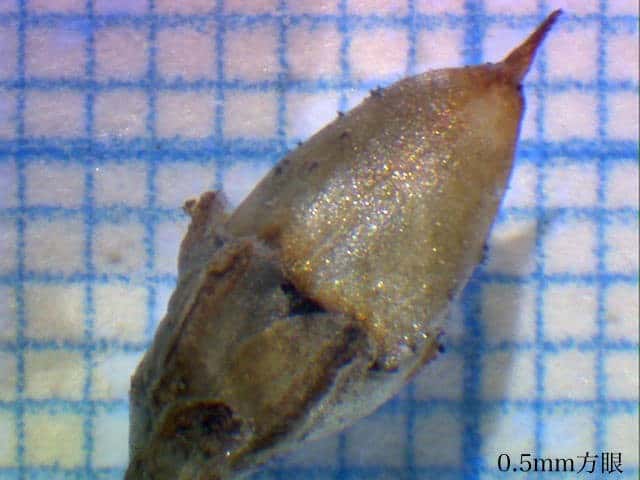 | ▼果実の蓋が取れると中に種子が4〜6個入っている。 | ▼種子の長さは約2.5mm。 | |