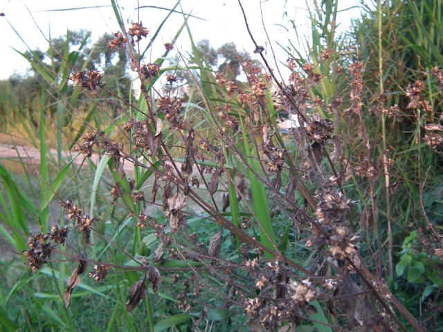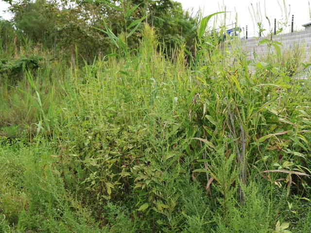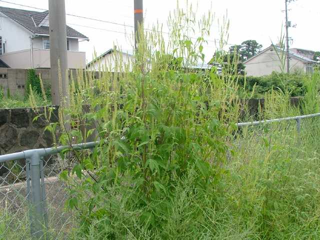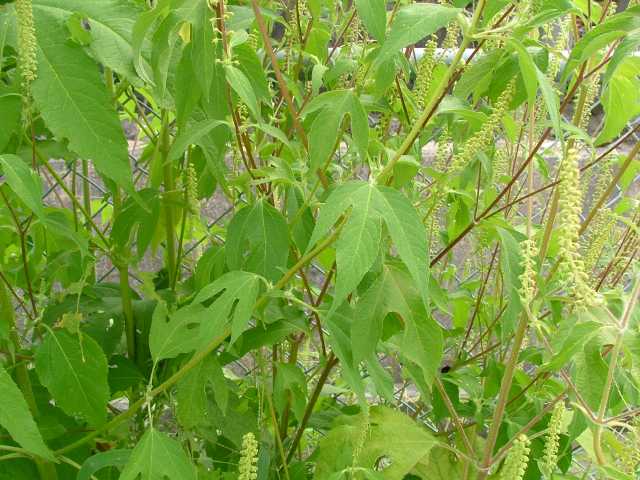 1年草 北アメリカ原産。1953年に関東地方で見つかり、現在では西日本を中心に沖縄県から北海道まで分布している。空地、鉄道線路沿い、河川敷などに大きな群落を作る。全体に毛が多く、茎はよく分岐して高さ3m、太さ2〜4cmにもなる。葉は長い柄があって対生し、葉身は長さ20〜30cm。葉は掌状に3〜7裂し、裂片は細長く尖って、両面ともざらつく。茎の頂に長い花穂を出して雄頭花をつけ、基部の苞葉内に雌頭花をつける。 花期は8〜9月。(日本帰化植物写真図鑑) 雌雄同株.雄の頭花は枝先に細長い穂を作り,総包片は合着して皿型になり,複数の筒状花を入れる.雄ずい5個.雌の頭花は雄花序の基部にある包葉にかくれて2~3個ずつつき,緑色のつぼ形の総包に雌ずいのみつく.偽果は長さ5~10mm,先はくちばしとなり,基部に4~8個の刺状の突起。(侵入生物データベース) 学名は、Ambrosia trifida キク科ブタクサ属 オオブタクサの雌頭花は、総苞に包まれた雌しべのみの1小花からなる。似た仲間に葉が羽状深裂するブタクサがある。 |
