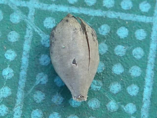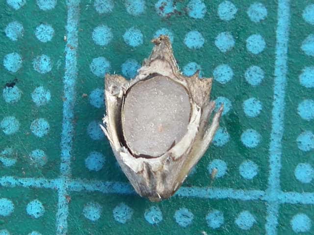 | 総苞に包まれた偽果は長さ約1cm。 | 偽果には稜があり、突起がある。 | 偽果の横断面。 |