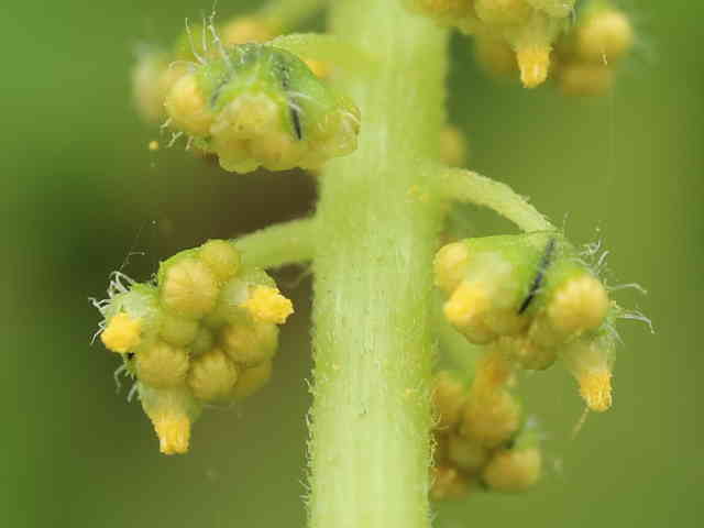 | ▼雄花の総苞は直径約3mm。 | ▼総苞に3本の黒線がある。 | |