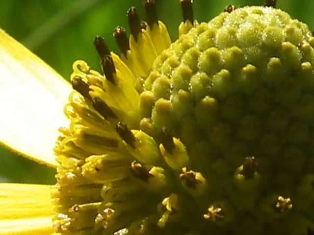 | 多年草 北アメリカ原産。明治時代中期に観賞用に導入されたが、逸出して鉄道線路沿いや河川敷などの湿った土地に大群落を形成するようになった。根株から茎をそう生し、上部で分岐して高さ3mになる。茎下部の葉は長い柄があり5〜7深裂し、裂片には粗い鋭鋸歯がある。上部の葉は短〜無柄で互生する。葉の裏にのみ短毛がある。枝の先端に直径6cmほどの黄色の頭状花をつける。舌状花は10〜14枚、筒状花は緑黄色。そう果は長さ5mmほどで、冠毛は突起状。花期は夏〜秋。(日本帰化植物写真図鑑) 学名は、Rudbekia laciniata キク科オオハンゴンソウ属 よく似たミツバオオハンゴンソウは花が直径5cmと小さく、下部の葉が3裂する。アラゲハンゴンソウは毛が多く、筒状花が暗褐色で、葉は分裂しない。 |