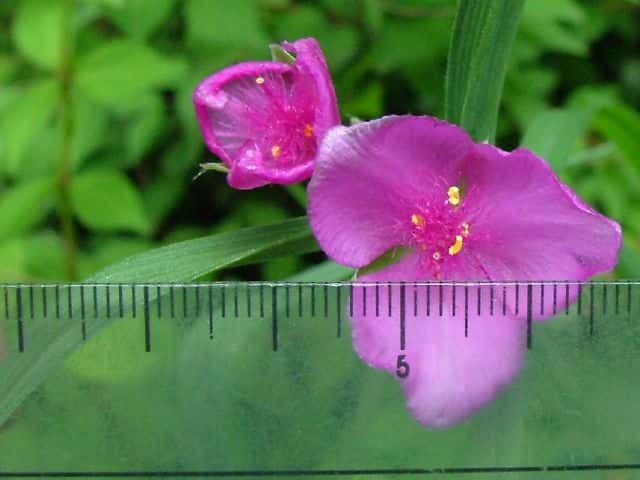 1年草 北アメリカ東部原産。 [三河の野草] ムラサキツユクサより草丈が低く、高さ5〜35cm。道端や空き地に野生化している。葉は長さ13〜37cm、幅0.4〜2.5cm、全縁、基部は鞘状。苞は葉状、まばらか密に毛がある。花柄は1.2〜3.5cm。萼片は3個、膨らみ均等、長さ7〜16mm、腺毛でない毛で覆われる。花弁は3個、青色、紫色、又はバラ色、白色、広卵形、長さ1.2〜2cm。雄しべ6個。花糸が紫色、下部に単細胞幅の細い毛が密生する。さく果は長さ4〜6mm。種子は長さ2〜3mm。花期は6〜9月。 学名は、Tradescantia virginiana ツユクサ科ムラサキツユクサ属 似た花のムラサキツユクサは草丈約15〜115cm、萼片が無毛または先端に毛の束がある。 |