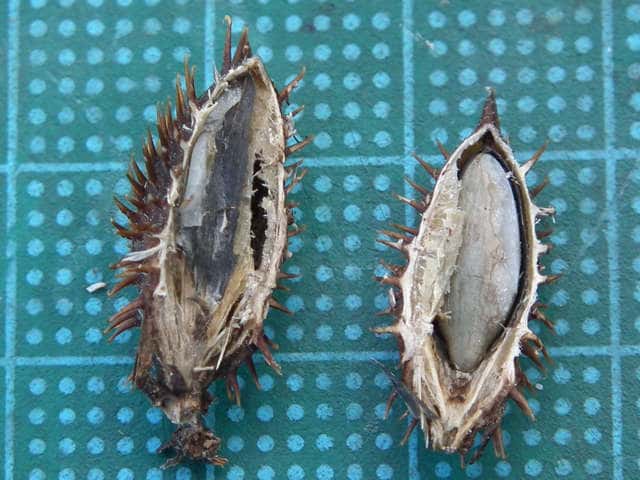 | ▼果苞は嘴を含めて長さ約2cm。 | ▼果苞の縦断面、2室ある。 | ▼仕切りを挟んで2個の果実がある。 |