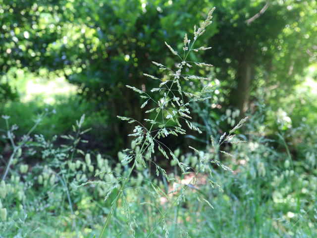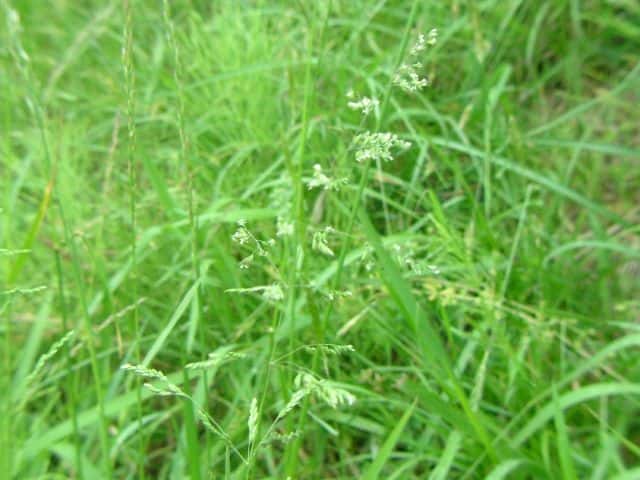 | 多年草 ヨーロッパから西アジアにかけての原産。全国に帰化しており、北海道などでは畑地の雑草になっている。細い根茎を引いてまばらに群生する。稈は細く、基部で伏してその上部で直立して高さ1mになる。葉は線形で無毛、葉舌は高さ6mmほどある。4個ほどの小花からなる長さ4mmほどの小穂を、細かく分岐した穂に多数つける。穂の枝の基部には小穂がつかない。花期は夏。(日本帰化植物写真図鑑) 耕地の周辺やたのあぜ、農道などに生育し、粗生または群生する。茎は一方に傾き、平滑で光沢があり、基部は伏臥し、細長い根茎に連なる。葉は無毛、葉舌は鋭形、白い半透明の膜質、長さ3〜4mm。葉鞘は平滑・無毛。花序は長さ20〜30cm、各節から2〜5個の枝を半輪生状に出し、一方に傾く。枝は細く糸状、長さ3〜10cm、上向きの短剛毛を生じ、小穂をまばらに着ける。小穂は長さ2.8から3mm、2〜3小花よりなる。第1苞穎は長さ2〜2.5mm、1〜3脈。第2苞穎は2.5〜3mm、3脈。護穎は5脈、先端は銅色に輝き、基部の竜骨と側脈に白色の毛をまばらに生じる。基部の縮れ毛は長い。花期は7〜8月。(日本イネ科植物図譜) 学名は、Poa trivialis イネ科イチゴツナギ属 よく似たものにイチゴツナギがあるが、花序の枝は斜上し開出しない。 ナガハグサは、葉舌が短い。 |