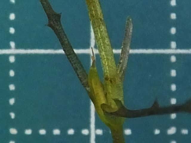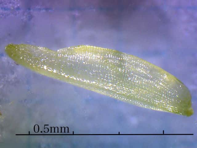 | ▼果実の下半部は葉鞘の中にある。 | ▼若い果実は長さ約2.8mm。 | ▼先端に2岐した柱頭が残る。 |