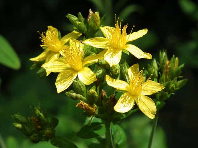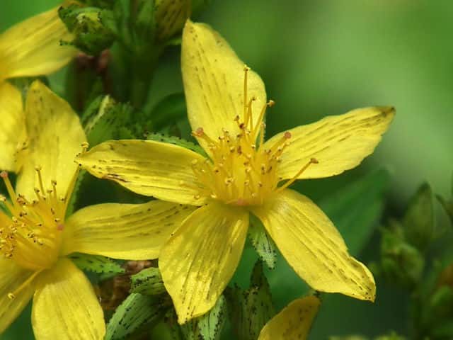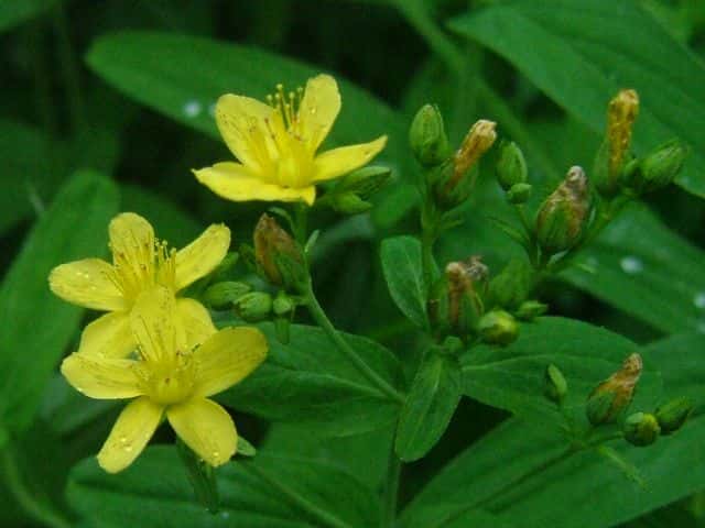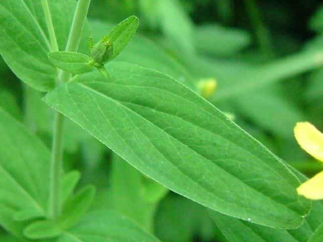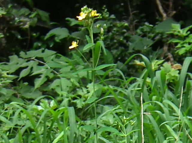 | 多年草 日本全土の日当たりのよい山野に生える。高さは30〜60cm。葉は対生し、長さ3〜6cm、幅0.7〜2cmの広披針形で黒点が多く、ふちにも黒点が並ぶ。葉の基部は円形〜心形でやや茎を抱く。花は黄色で直径1.5〜2.5cm。花弁と萼片には黒点と黒線がある。雄しべは多数あり、基部で短く合着して3つの束にわかれている。さく果には縦の明線が入る。葉の形、黒点の有無などに変異が多く、多くの変種や品種がある。花期は7〜9月。(野に咲く花) 学名は、Hypericum erectum オトギリソウ科オトギリソウ属 |