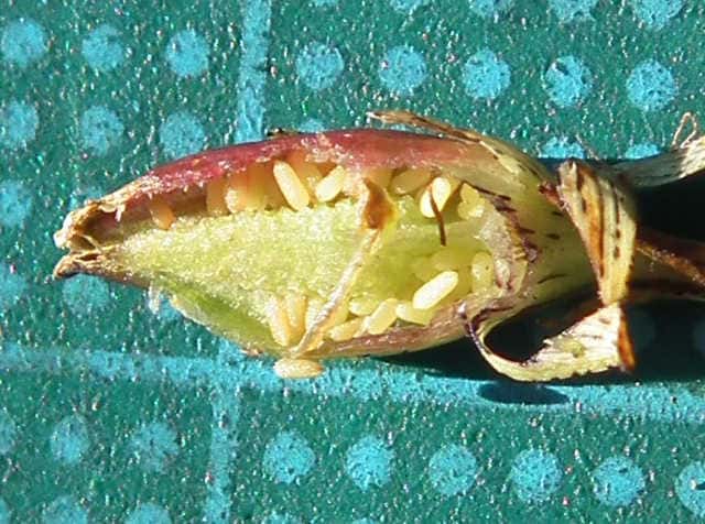 | ▼果実は長さ約5mm。 | ▼熟すと3裂し種子をだす。3個の花柱が残る。 | ▼種子は長さ約0.7mm。 |