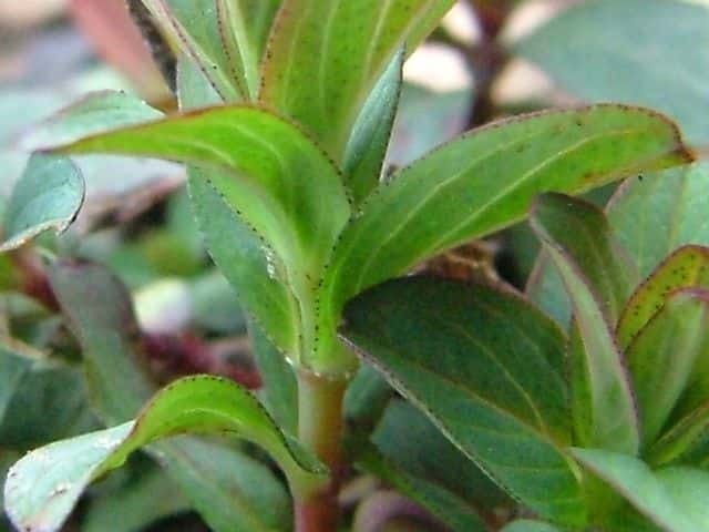 | ▼対生する葉は無柄でやや茎を抱く。 | ▼葉は黒点が多い。 | |