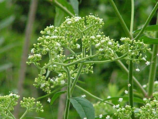 | 多年草。 北海道〜九州の日当たりのよい山野にごくふつうに見られる。高さ0.6〜1m。根元から長い匐枝をだし、先端に新苗をつくる。茎の下部には白い粗毛が多いが、上部では少ない。葉は対生し、長さ3〜15cm。多くは羽状に分裂し、裂片は卵状長楕円形で頂裂片が最も大きい。花は白色で、散房状に多数つく。果実はそう果、長さ約3mmの倒卵形で、小苞が大きくなって、果実を取り巻き、うちわのような翼になる。花期は8〜10月。(野に咲く花) 学名は、Patrinia villosa スイカズラ科オミナエシ属 オトコエシ種内における高次倍数体間の交雑によるものとして、オトコオミナエシがあり、黄花や白花が混在する。 仲間のオミナエシは匍匐枝を出さず、地下茎で増え、花は黄色。 |