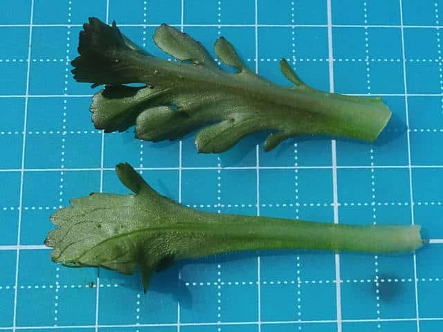 | ▼一度切られた茎から出た枝で、時期が遅くなったためか、正常でない花序を出している。 | ▼小苞?が大きな葉状になっている。 | |