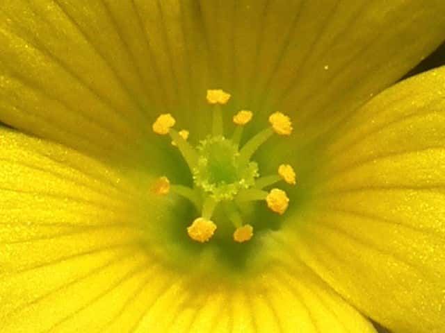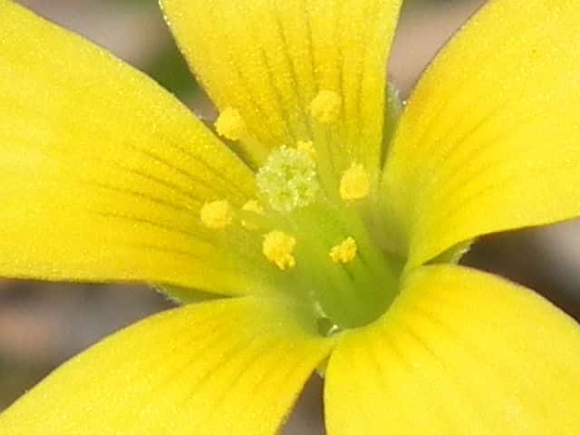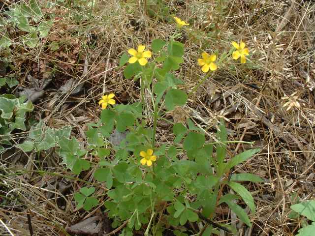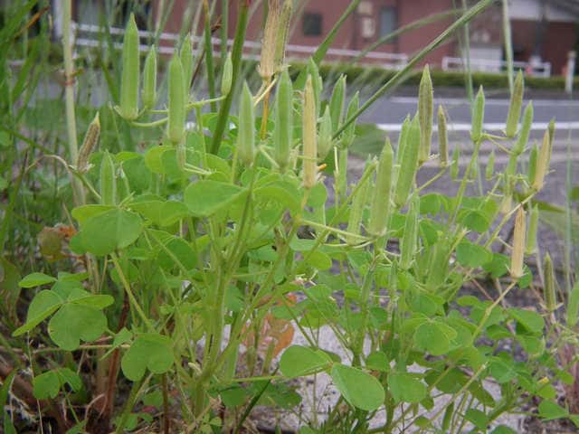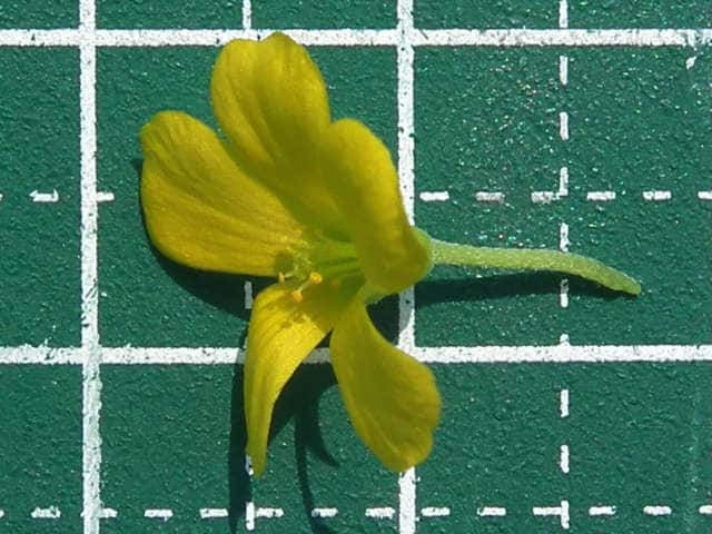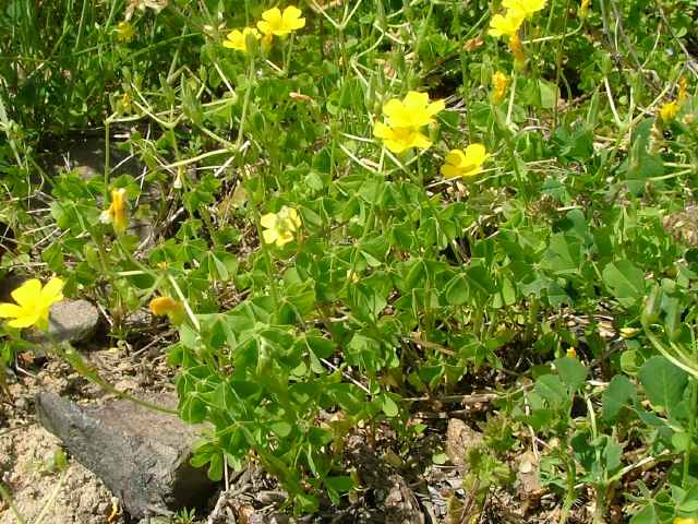 | 多年草 北アメリカ原産。1962年京都府精華町で見いだされ、第2次世界対戦後に駐留アメリカ軍の荷物について侵入したものと考えられている。関東北部以西の道ばたなどに時折発生する。カタバミによく似ているが、地上茎はすべて地中を横走する根茎から生じて高さ10〜50cmに達する。花はカタバミとほぼ同じ黄色の5弁花、花後に果柄が下向する。全体に白い毛が多いこと、托葉がごく小さくて目立たないことでもカタバミと識別できる。花期は春〜秋。 学名は、Oxalis dillenii カタバミ科カタバミ属 |